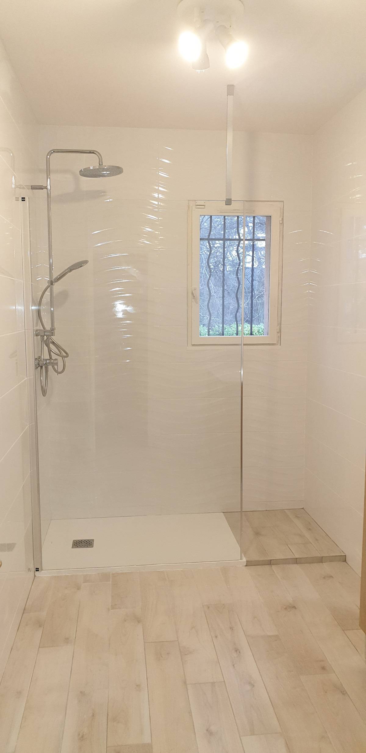Carrelage imitation parquet couleur chêne naturel posée à Marignane. Ce carrelage rectifié coloré masse vous ai proposé en différents coloris en fonction de l'ambiance que vous souhaitez apporter. Une faïence a également été mise en format 30X60 blanc brillant décor vagues.